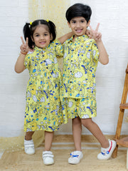 Yellow Cartoon Print Sibling Co-Ord Set – Dress for Girls & Shirt-Shorts Set for Boys - 1-2 years